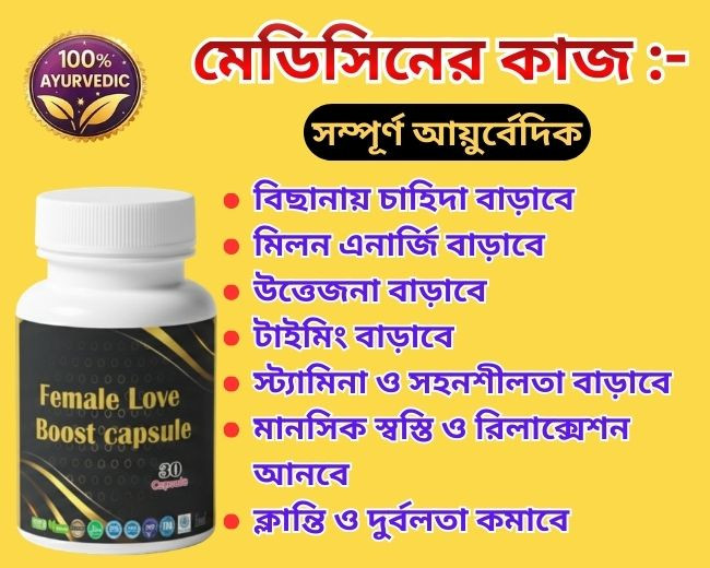 এই ক্যাপসুলটি বিবাহিত নারীদের জন্য আয়ুর্বেদিক ফর্মুলায় বানানো হয়েছে। এটি নারীদের সহবাসের ক্ষমতাকে বাড়াবে এবং পুরুষ সঙ্গী কে স্যাটিসফাই করতে সাহায্য করবে। বর্তমান ব্যস্ত জীবন, মানসিক চাপ, হরমোনের পরিবর্তন এবং পুষ্টির ঘাটতির কারণে অনেক নারীই কম এনার্জি, আগ্রহের অভাব ও শারীরিক দুর্বলতা অনুভব করেন। এই সমস্যাগুলোর সমাধানে প্রাকৃতিক উপাদানে তৈরি আমাদের Women Love Boost Capsule. এটি সম্পূর্ণ রূপে আয়ুর্বেদিক কোনো রকম সাইড এফেক্ট নেই। তবে কোনো গর্ভবতি নারী এই ক্যাপসুল টি খাবেন না।